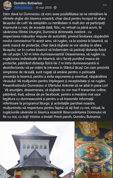 După o așteptare apăsătoare si dureroasă data de 13 mai 2020 a adus o rază de bucurie în sufletele tuturor enoriașilor: credincioșii vor avea voie să participe fizic la slujbele Bisericii. Părintele paroh Dumitru Butnariuc a transmis vestea : Dăm slavă lui Dumnezeu că vom avea posibilitatea să ne reîntălnim la sfintele slujbe din biserica noastră, chiar dacă pentru început în afara lăcașului de cult! Va asteptăm cu nerăbdare si mult dor să participaţi impreună cu noi, de această dată, fizic, nu virtual ca până acum, la săvărsirea Sfintei Liturghii, Duminică dimineată, evident , cu respectarea măsurilor impuse de autorităti, privind limitarea răspândirii noului coronavirus!