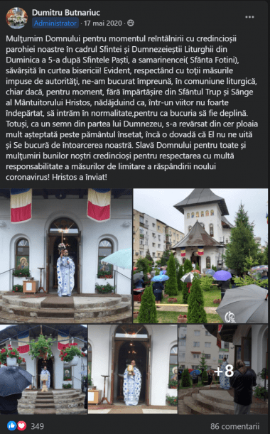 Iar data de 17 mai 2020 avea să împlinească această așteptare: prima slujbă la care credincioșii, cu mic cu mare au putut participa fizic. Bucuria a fost cu atât mai mare cu cât, după o perioadă de secetă Dumnezeu a binecuvântat pământul cu darul ploii : Mulţumim Domnului pentru momentul reîntâlnirii cu credincioșii parohiei noastre în cadrul Sfintei și Dumnezeieștii Liturghii din Duminica a 5-a după Sfintele Paști, a samarinencei( Sfânta Fotini), săvârșită în curtea bisericii! Evident, respectând cu toţii măsurile impuse de autorităţi, ne-am bucurat împreună, în comuniune liturgică, chiar dacă, pentru moment, fără împărtășire din Sfântul Trup și Sânge al Mântuitorului Hristos, nădăjduind ca, într-un viitor nu foarte îndepărtat, să intrăm în normalitate,pentru ca bucuria să fie deplină. Totuși, ca un semn din partea lui Dumnezeu, s-a revărsat din cer ploaia mult așteptată peste pământul însetat, încă o dovadă că El nu ne uită și Se bucură de întoarcerea noastră. Slavă Domnului pentru toate și mulţumiri bunilor noștri credincioși pentru respectarea cu multă responsabilitate a măsurilor de limitare a răspândirii noului coronavirus! Hristos a înviat!(preot paroh, Dumitru Butnariuc).